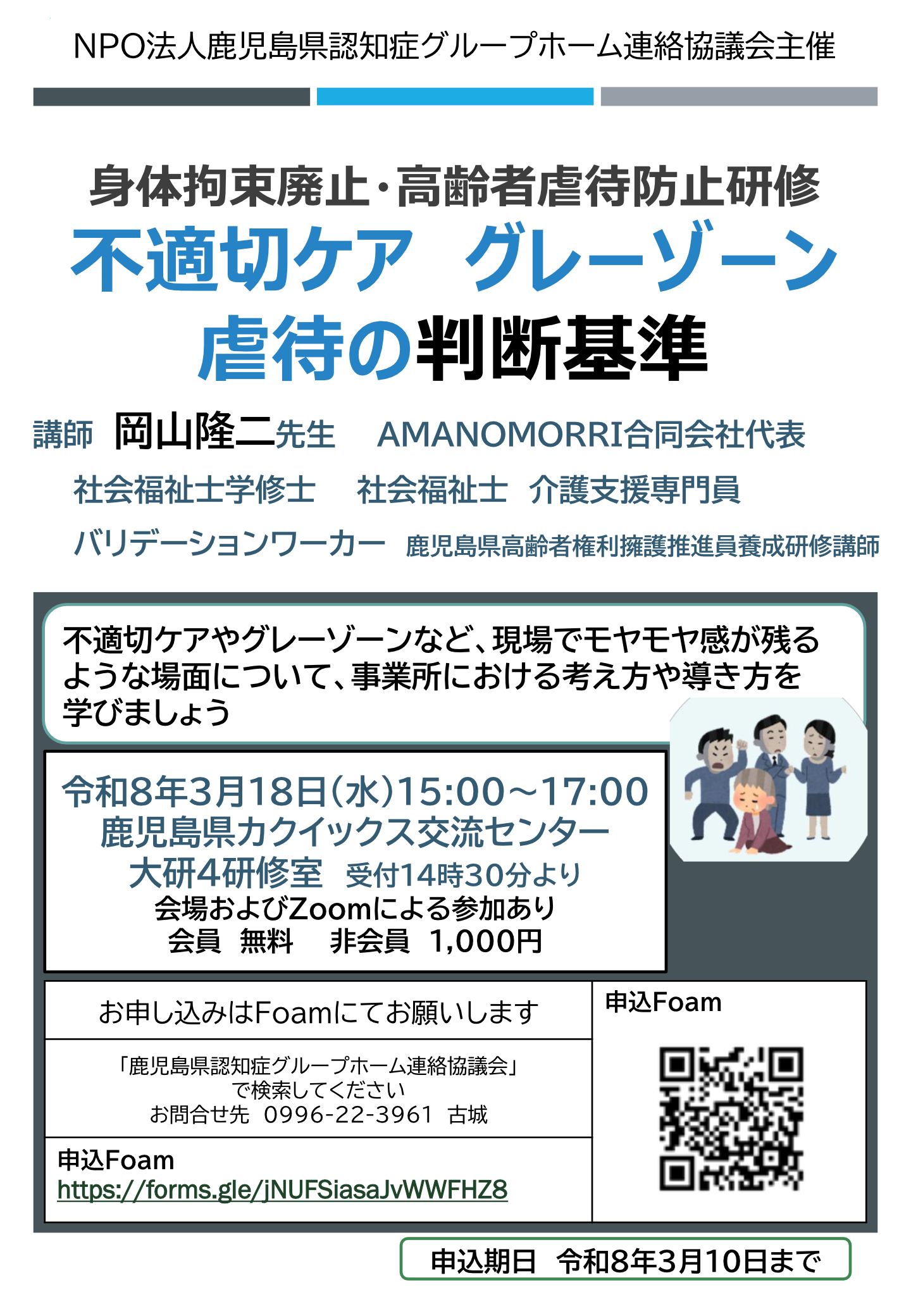 当協議会は毎年 3 月に「身体拘束廃止・高齢者虐待防止研修会」を開催しておりす。今年度は講師として、鹿児島県高齢者権利擁護推進員養成研修講師の岡山隆二先生にお願いしました。不適切ケアやグレーゾーンなど、現場にモヤモヤ感が残るような場面について、事業所の考え方や導き方を学ぶ研修になればと思っております。大変お忙しい中だと思いますが多数の皆様にご参加いただきますようお願い申し上げます。